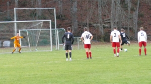 SG Inzell/Weißbach Torhüter Pirmin Gollinger zeigte einen tollen Reflex und parierte den Strafstoß von Philip Hosp (Nr. 15) bravourös. Damit sicherte er seiner Mannschaft wenigstens einen Punkt im letzten Spiel vor der Winterpause.