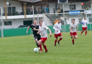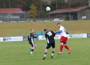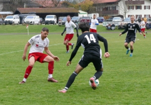 SG Kapitän Emmeran Gehmacher musste sich ob der numerischen Unterzahl oft um Abwehraufgaben kümmern. Hier wird er attackiert von Philip Hosp, der mit einem vergebenen Strafstoß die große Chance zum Sieg verpasste.