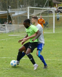 SG Inzell/Weißbach Abwehrchef Rene Brüning-Wolter (links) hatte es oftmals mit FC Bischofswiesens Torjäger und Torschütze zum Ausgleich Fabrice Enyange zu tun, musste aber leider frühzeitig das Feld verletzungsbedingt verlassen.